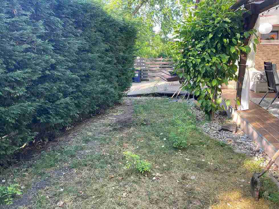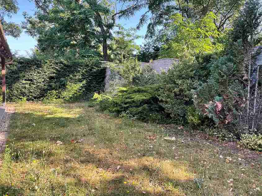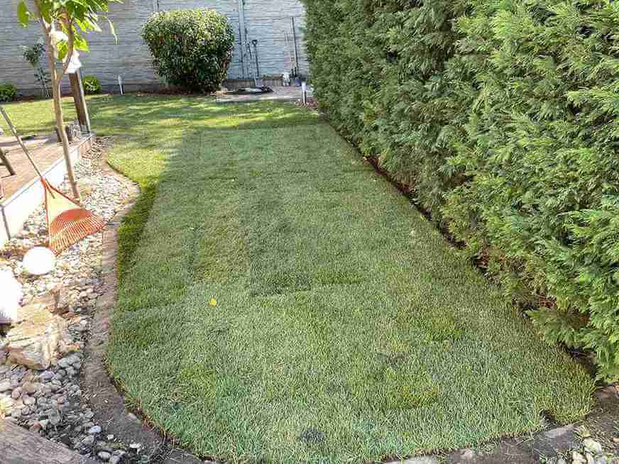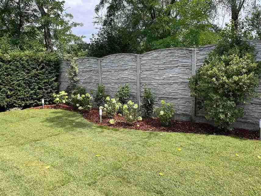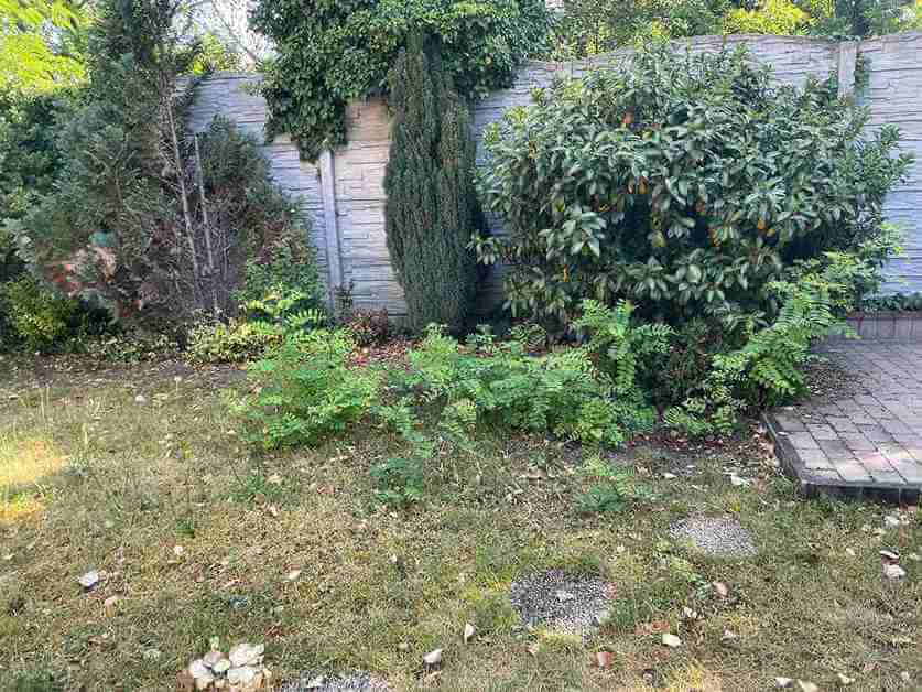 A gyomos területet kitakarítottuk, a kerítés mellett kialakítottuk az ágyást, melybe örökzöldek kerültek. A gyomosodás és a termőföld kiszáradás ellen a talajt fakéreggel takartuk be. Végül leterítettük a gyepszőnyeget.