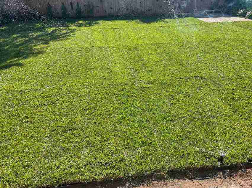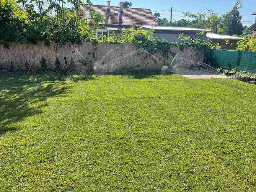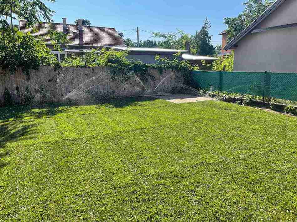 Családi ház hátsó, tekintetekről elzárt területén öntözőrendszert telepítettünk, és gyepszőnyeget terítettünk le.