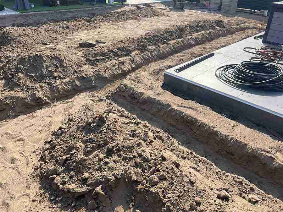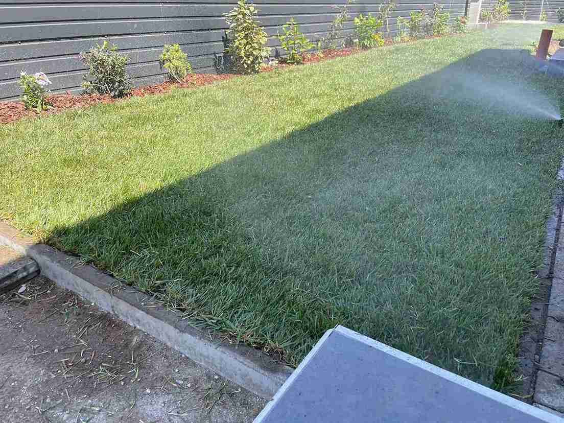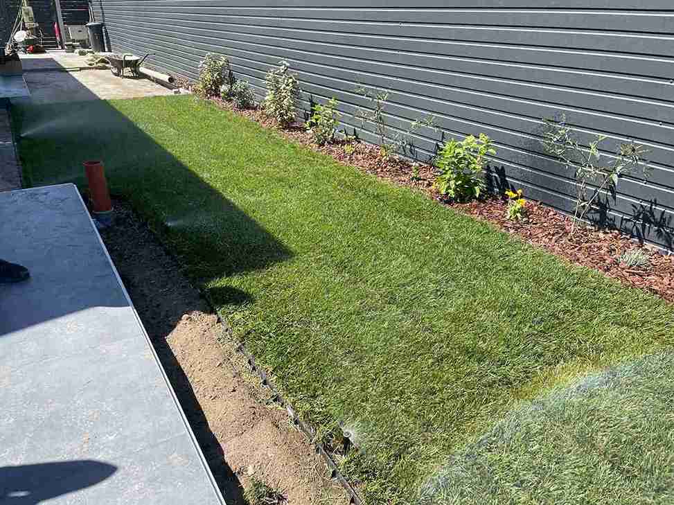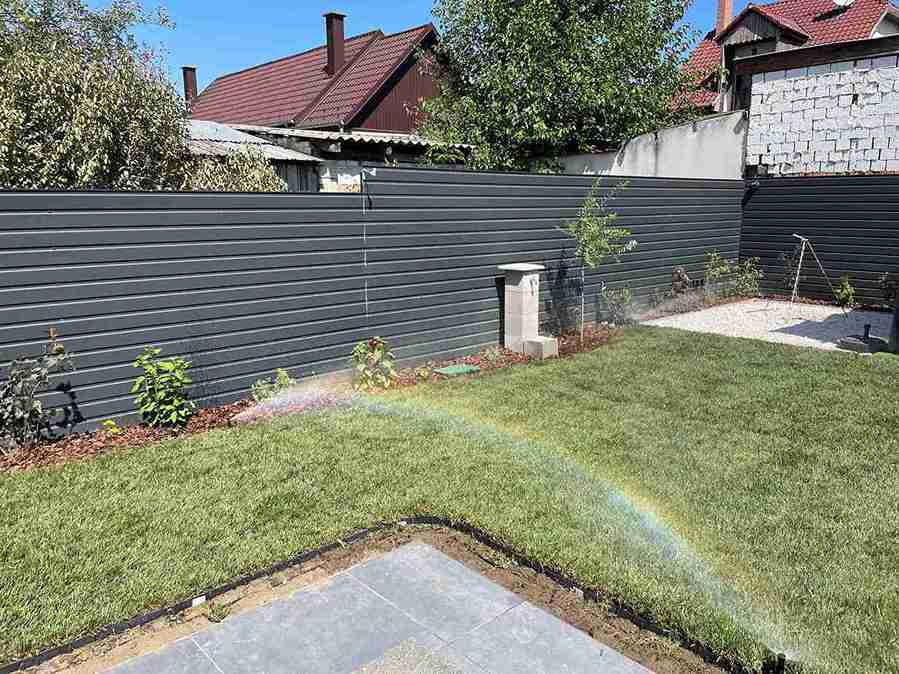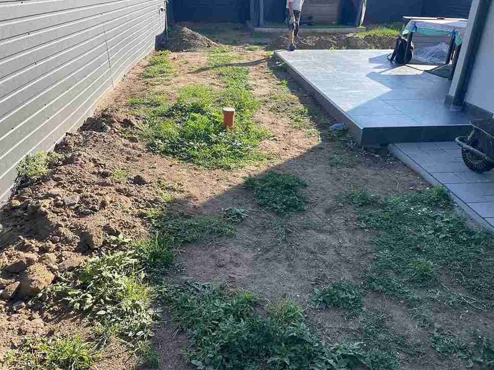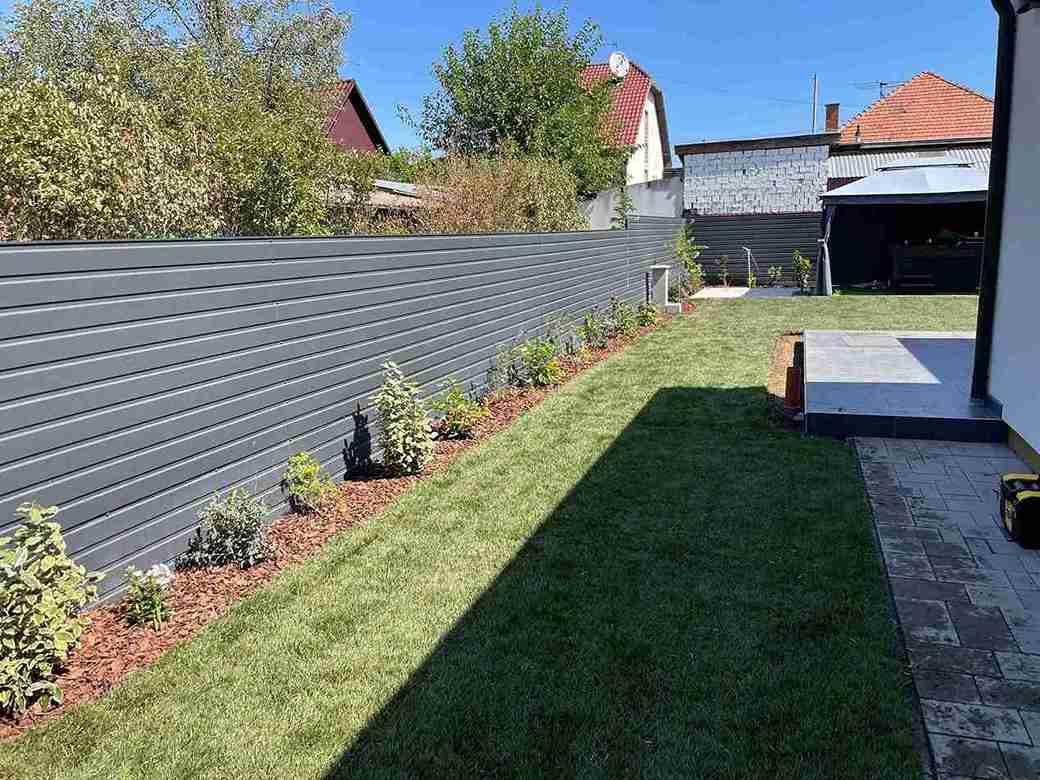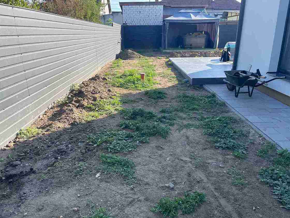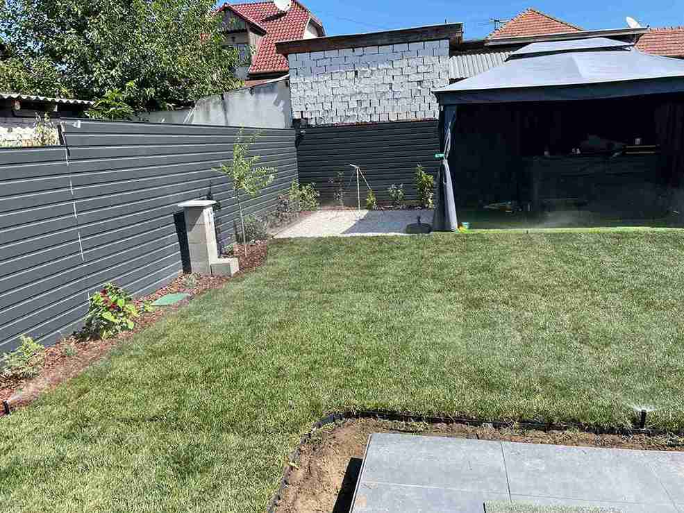 Gyomtalanítás és tereprendezés után kiástuk az öntözőrendszer helyét, majd telepítettük azt. A kerítés mellé kialakítottuk az ágyás, melybe örökzöldeket ültettünk. A munka végső szakaszában leterítettük a műfüvet és a gyepszőnyeget.