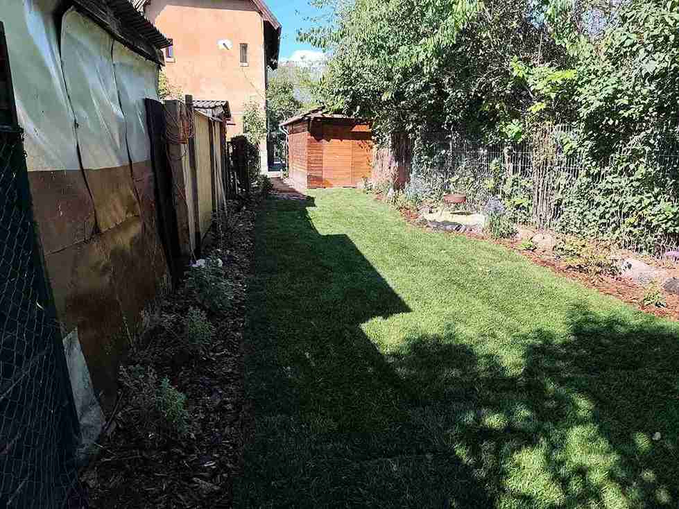 Egy aprócska kertet újítottunk meg. Gyomtalanítottunk, öntözőrendszert telepítettünk, majd lefektettük a gyepszőnyeget.