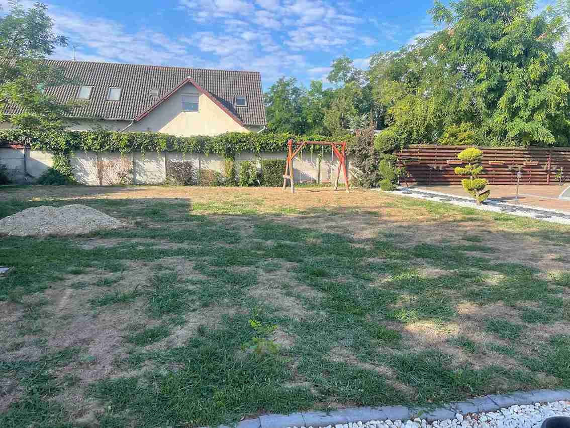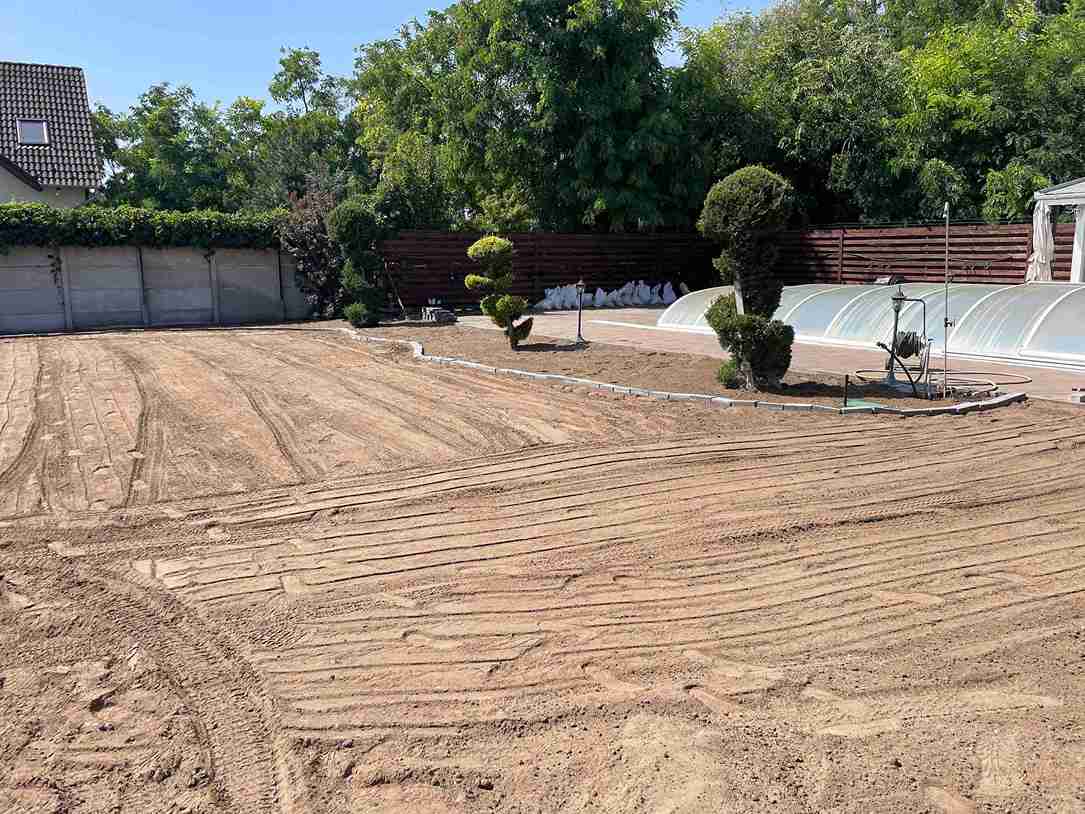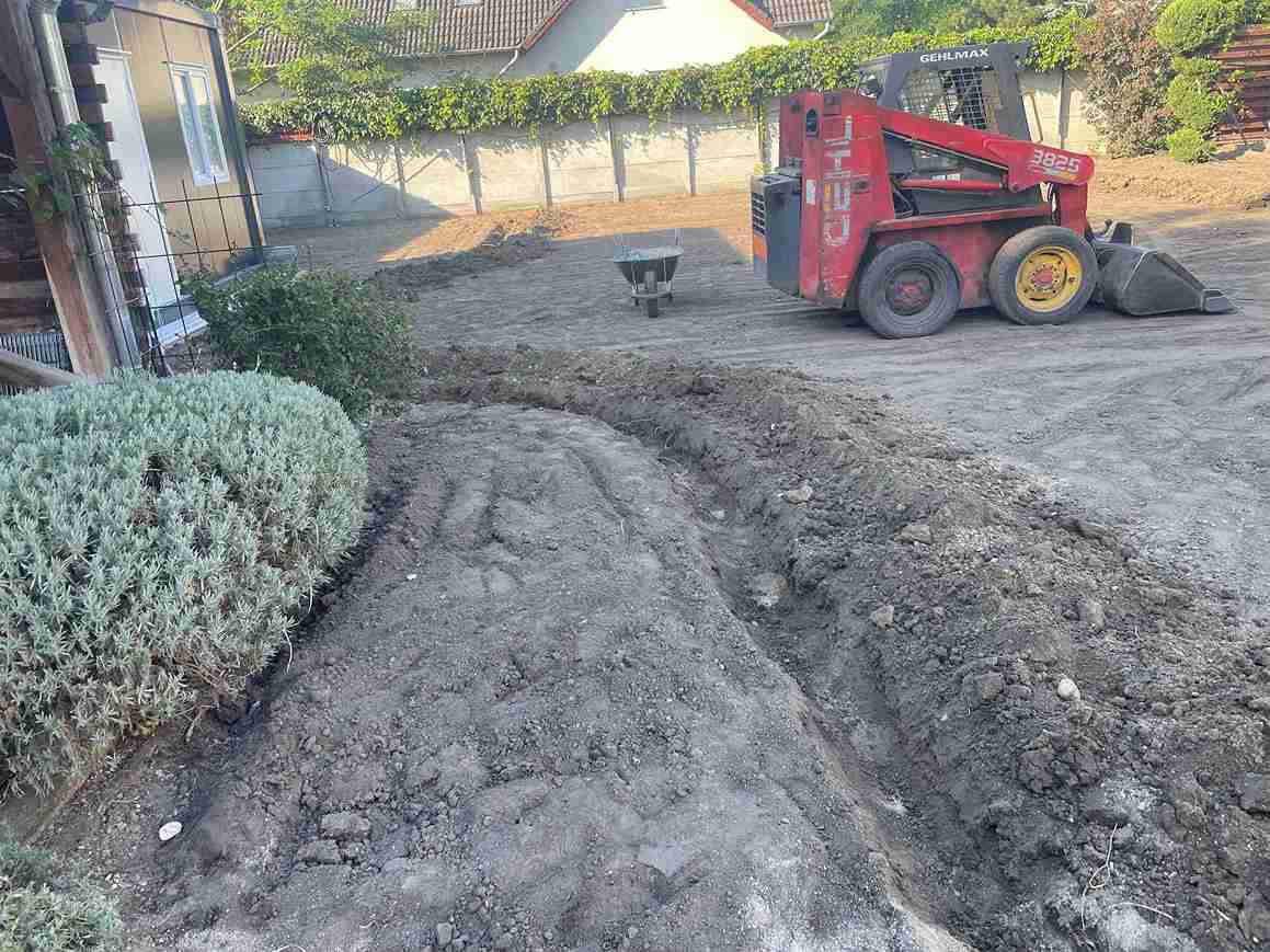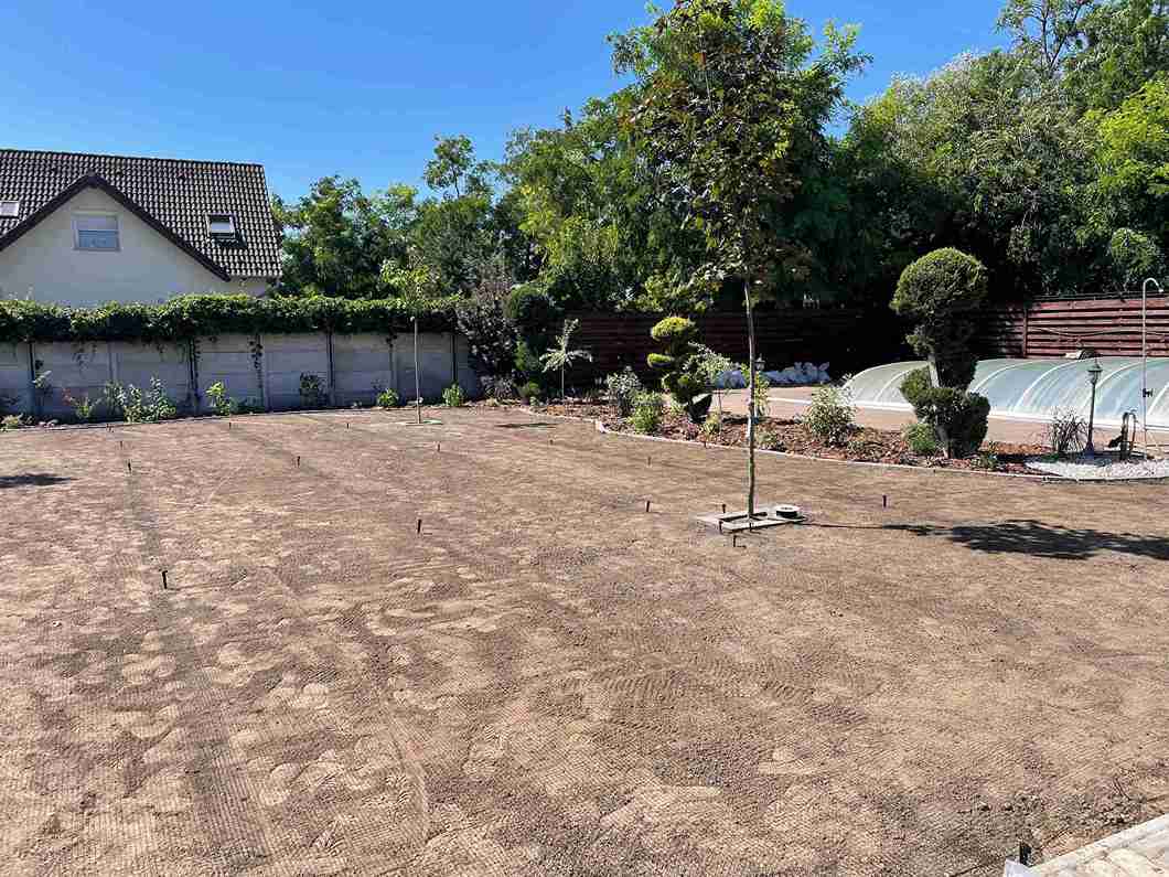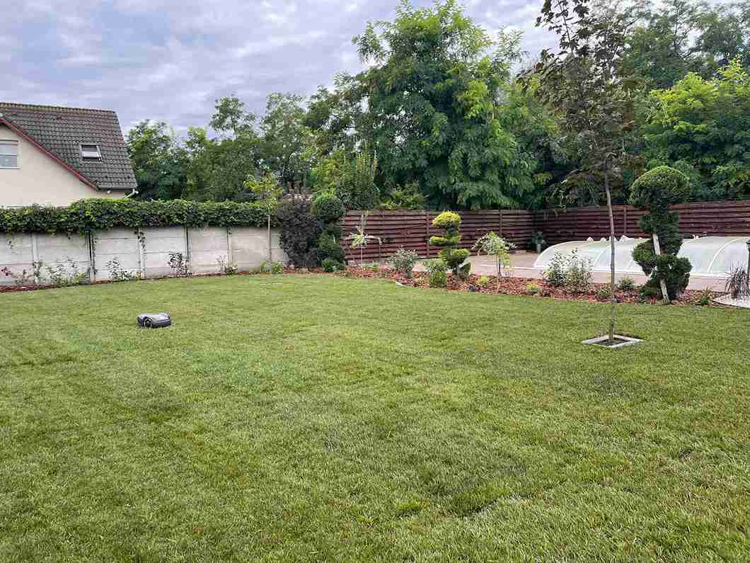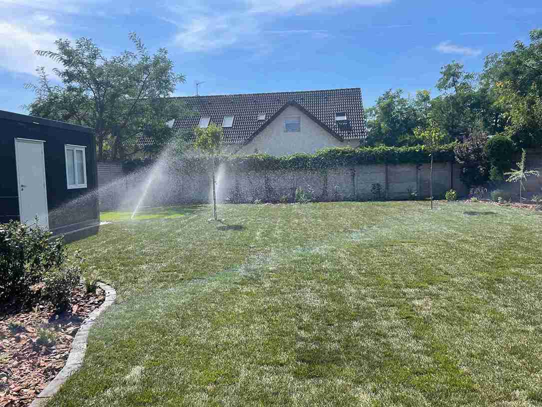A tereprendezés után öntözőrendszert telepítettünk, az elöregedett, formára nyírt thuják helyére újakat ültettünk, az ágyást mulcsoztuk, és legvégül a gyepszőnyeget terítettük le.